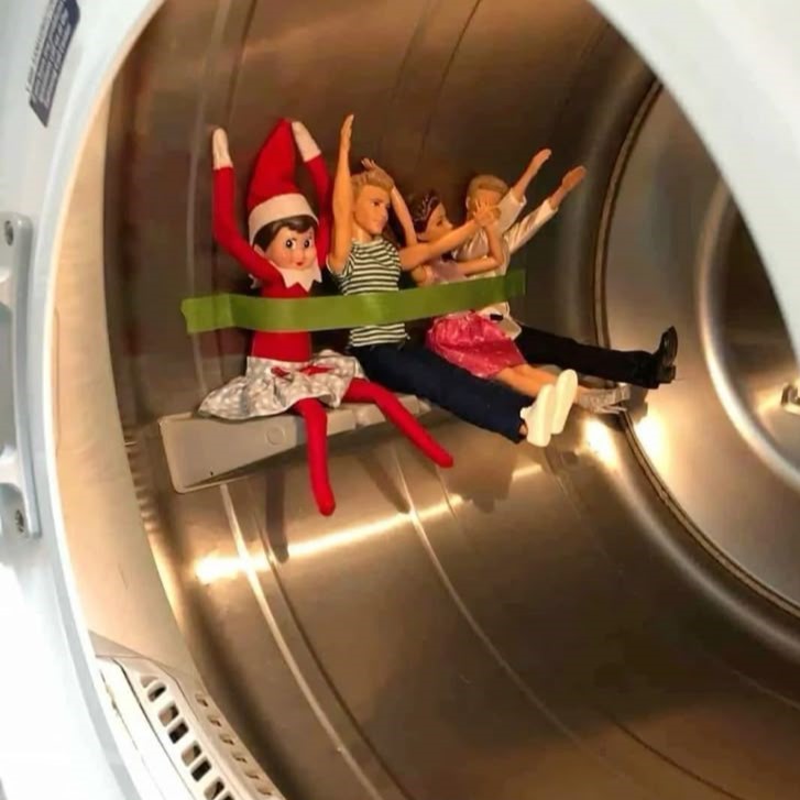 This one’s an action scene! Strap your elf and a few dolls inside the dryer using a ribbon or tape, like they’re on a theme park ride. Their hands in the air make it look like the best roller coaster ever. Just make sure the dryer stays off — safety first for your elf crew!