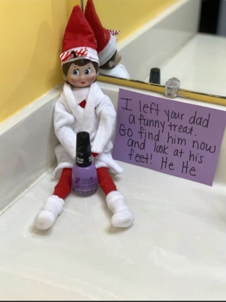 Your mischievous elf is up to beauty business! Dress your elf in a robe, sit them near a mirror, and add a bottle of nail polish with a note that says they left Dad a “funny treat.” When kids discover Dad’s painted toenails, everyone will burst out laughing. A classic prank that’s harmless and hilarious!