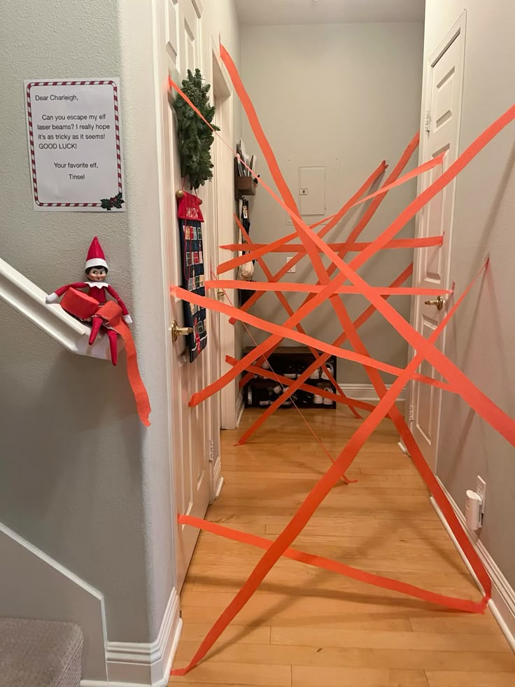 This idea looks wild, but it’s actually super quick. You just tape long strips of paper across the hallway, making it look like a laser maze challenge. The elf sits nearby, holding a strip like he made the whole trap. Kids will love crawling under and over the “lasers.”