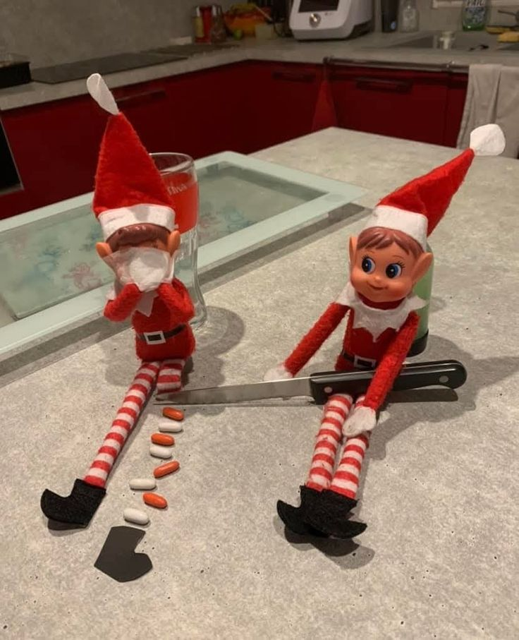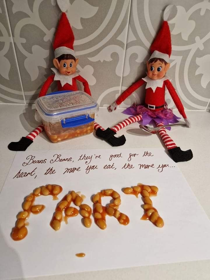 For a silly and slightly gross laugh, arrange two elves near a plate of baked beans. Spell out the word “FART” with the beans and write, “Beans, beans, they’re good for the heart, the more you eat, the more you…” above it. It’s the kind of humor kids find absolutely hilarious — a cheeky classic!