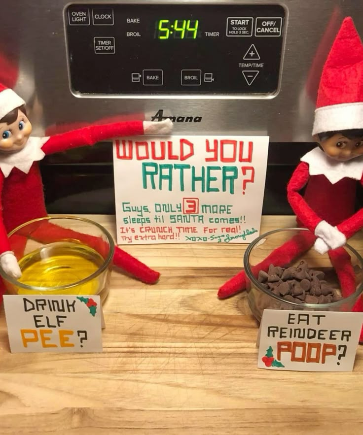 Set up a hilarious “Would You Rather?” challenge featuring your elves! One dares you to drink “elf pee” (just apple juice!) while the other tempts you with “reindeer poop” (chocolate chips). Place a sign with the question and let the fun begin — it’s gross, goofy, and totally festive!