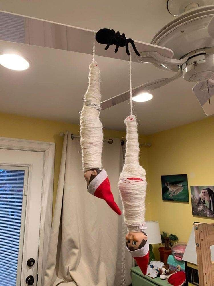 Uh oh — looks like these elves got caught by a giant spider! Wrap them in white yarn or string and hang them from a ceiling fan or light fixture. Add a fake spider for extra drama. It’s a little spooky, a little silly, and totally hilarious!