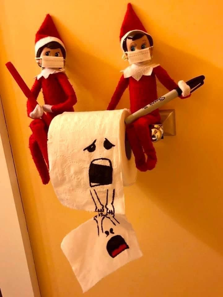 These mischievous elves got into the toilet paper again! They’ve drawn scared little faces on the roll — complete with one hanging on for dear life. Add tiny markers to their hands for the full crime scene effect. A funny bathroom surprise that will make everyone giggle!