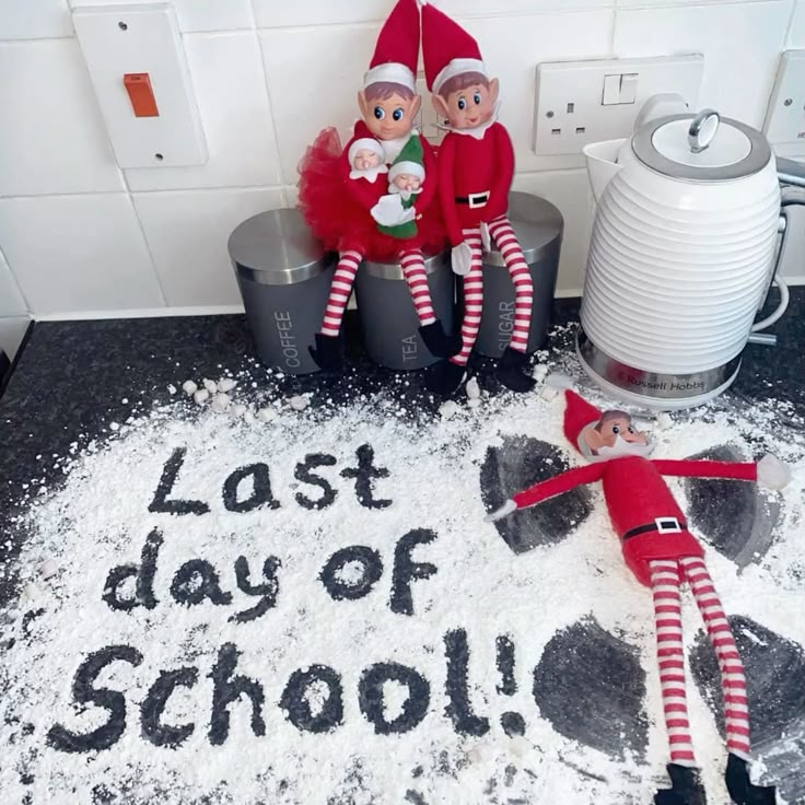 Celebrate the end of the school term with a cheerful (and slightly messy) elf party! Spread flour or powdered sugar on the counter, write “Last Day of School!” in it, and position one elf making snow angels while others sit proudly nearby. It’s festive, funny, and a perfect way to mark the start of the holidays.